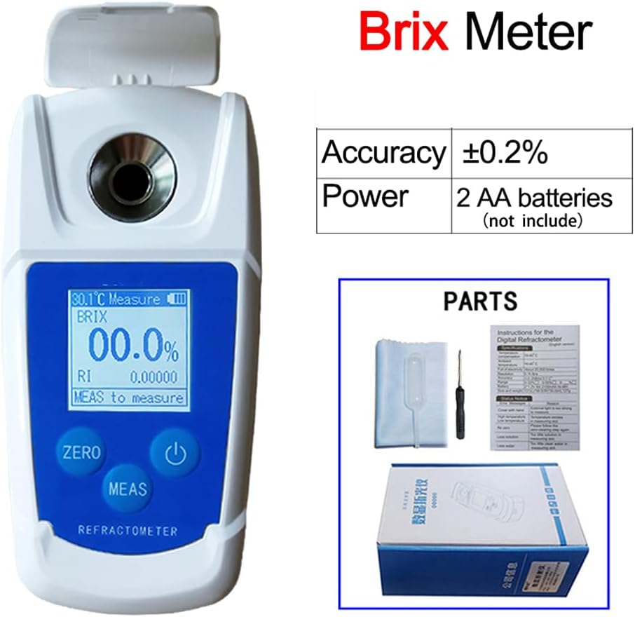 0-55% digital Brix Refractometer Brix tester tester Fruit Juice Beer Drinks Wine Sugar Content Measuring Tool suger meter Characteristic: 1. Widely used in food, beverage, fruit sugar content determination, crop sugar content determination and other fields. 2. Built in high quality integrated circuit, high measurement accuracy, sensitive response, fast measurement speed, long-term use. 3. Equipped with high transmission refraction prism, high precision optical electronic instrument, one thousandth of resolution. 4. Support temperature compensation function, automatic calibration, not affected by the environment, automatic elimination of measurement errors. 5. It features high-definition display backlight, supporting three kinds of data display, clear and intuitive, and more convenient to use. 6. The product should be measured after the liquid is evenly mixed. The method of operation is simple and practical. Specifications: Temperature compensation:10-40℃ Ambient temperature:10-40℃ Full of electricity:About 20,000 times Resolution:0.1% Brix Accuracy:±02%Brix/±1℃ Range:0-55% Battery:2*AA Battery(cannot be recharged)(Delivery battery)
