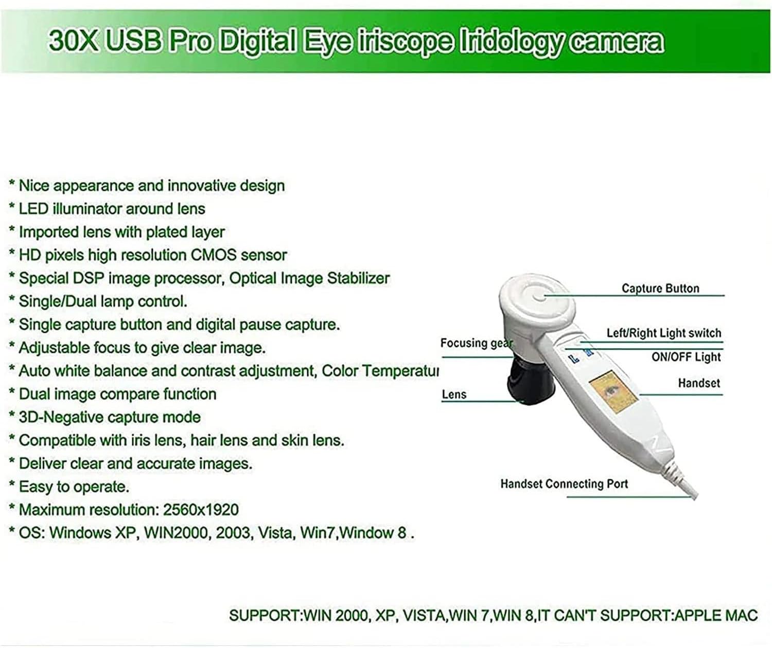 Introducing our advanced Iris Mirror, the ultimate iris analysis camera designed to help you monitor your health effortlessly. With the ability to assess your eyes, skin, and hair, this innovative device allows you to identify potential health issues quickly and effectively. Imagine having a personal health advisor that guides you in avoiding diseases and maintaining optimal wellness. Equipped with state-of-the-art health analysis software, the Iris Mirror provides a comprehensive overview of your physical condition. It recommends tailored health foods and lifestyle plans, empowering you to take proactive steps in caring for your body. **Key Features:** - **High-Quality Imaging**: The dedicated DSP image processor and optical image stabilizer ensure clear and stable images for accurate analysis. - **User-Friendly Design**: With a one-button microcontroller and digital pause function, capturing your iris image is simple and convenient. - **High Resolution**: The imported 5-megapixel CMOS sensor delivers stunning clarity, allowing for detailed examination. - **Comprehensive Reporting**: Our automatic iris software generates customer management reports, making it easy to track your health journey. - **Optimal Lighting**: The full-spectrum LED natural light and advanced lens coating provide ideal illumination for precise observations. The electronic control of left and right lights ensures that you can view and compare images of both eyes side by side. **Compatibility**: The Iris Mirror is compatible with various operating systems, including XP, WIN2000, 2003, Vista, Win7, Win8, and Win10, making it versatile for any user. **What’s in the Box**: - 1 x Iris Camera - 1 x Iris Lens - 1 x Aluminum Case - 1 x Lens Protection Cap - 1 x Iris Study Paper - 1 x User Manual - 1 x CD (includes driver and professional analysis software) - 1 x Software USB Key If you have any questions regarding our product, feel free to reach out via email. We are committed to providing ...