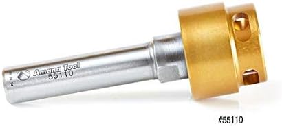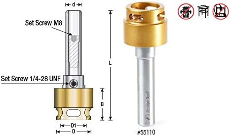This 3D adapter is a versatile device used for making compound curves by inserting the adapter over any 1/4" Shank router bit. By making it as an adapter and not a solid tool, The system becomes much more flexible as well as cost effective. Insert adapter over any tool with 1/4" Shank up to the maximum diameter of the adapter. For example, tool No. 55110 will fit all tools with up to a 3/4" Cutting diameter. The cutting length is adjustable and is limitless to shapes and tools This adapter may be used for. This adapter was made with 1/2" Shank and it can be used in routers with a recommended maximum RPM of 18, 000. This 3D system may be useful especially for small objects, artistic works and other delicate projects. Hence, it could be a complementary system for the Amana miniature router bits with a 3/16" Diameter ball bearing. Additionally, this tool can also be used for small jobs with a drill machine (when one doesn't have a router). in this case, the outer ring, which revolves against the tool, serves as a small "router Table". For this application, Amana recommends a minimum of 3, 000 RPM, #55110, diameter (D) 1-1/16, cutting Height (B) 1, shank (D) 1/2, overall length (L) 3-D/32, D1 25/32, 55110 3D adapter 1-1/16 dia x 1 x 1/2 inch Shank