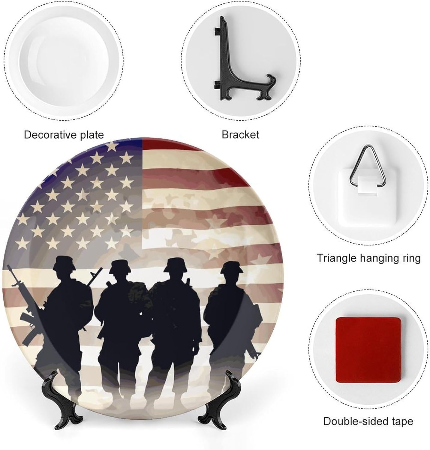 Our versatile ceramic Armed Forces Day American plates are made of smooth ceramic material. The lightweight bone china plates can be easily placed anywhere you like, showcasing their decorative charm.This bone china dessert plate is available in four sizes: 6 inches, 7 inches, 8 inches, and 10 inches, making it an ideal choice for display items.Personalized decorative plates, perfect for displaying handicrafts, are an ideal choice for home décor. This vertical ceramic plate makes a wonderful gift for housewarmings, anniversaries, weddings, birthdays, Thanksgiving, New Year's, or any holiday.This French country-style ceramic plate is suitable for decorating or using in living rooms, offices, hallways, dining rooms, entrances, hotels, holiday homes, and other places.