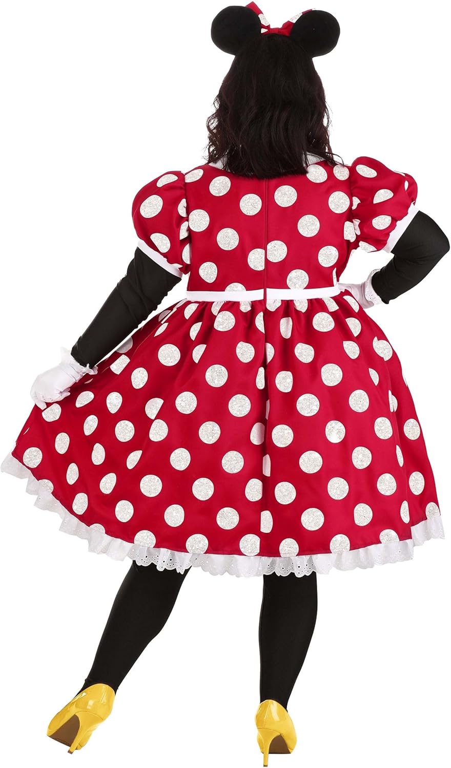 Disney Minnie Mouse Plus Size Costume Adult Plus Size: Celebrate the Disney darling with our exclusive Plus Size Minnie Mouse Costume! The ensemble recreates Minnie's classic red and white polka dot outfit, complete with a matching bow. Slip on the opaque black leggings. Zip into the bell-shaped dress with its puff-sleeves capping stitched-in long black sleeves and you'll be transformed into the beloved character. A petticoat attached under the polka dot top skirt ensures the costume dress keeps a full shape. Meanwhile, the included Minnie Mouse ears promise you're fully recognized as Disney's enduring leading lady! Product Details: Gloves: 85% polyester, 15% spandex; all other pieces: 100% polyester Twill dress has back zipper, built-in petticoat Dress has double sleeves--snug-fitting black long sleeves to give the look of Minnie's fur, and short puffy dress sleeves Solid white collar, puffed sleeve cuffs, & sewn-in waist sash All-over printed glittery polka dots Eyelet hem ruffle Slim-fit leggings have elastic waistband Fabric-covered plastic headband has foam-backed velour ears on top along with bow of same fabric as dress Stretch-knit gloves have ruffled eyelet cuffs Officially licensed Disney Minnie Mouse Costume Size Chart: 1X: Chest=45"; Short Sleeve Length=10 3/4"; Long Sleeve Length=24 1/2"; Dress Waist (empire waist)=38"; Dress Length=40 3/4"; Leggings Waist=34 1/2" - 56"; Inseam=31 1/4" 2X: Chest=49"; Short Sleeve Length=11"; Long Sleeve Length=25"; Dress Waist (empire waist)=42"; Dress Length=42"; Leggings Waist=38 1/2" - 60"; Inseam=30 3/4" 3X: Chest=53"; Short Sleeve Length=11 1/4"; Long Sleeve Length=25 1/2"; Dress Waist (empire waist)=46"; Dress Length=42"; Leggings Waist=42 1/2" - 64"; Inseam=30 1/4" 4X: Chest=57"; Short Sleeve Length=11 1/2"; Long Sleeve Length=26"; Dress Waist (empire waist)=50"; Dress Length=43 3/4"; Leggings Waist=46 1/2" - 68"; Inseam=30 1/4" 5X: Chest=61"; Short Sleeve Length=11 3/4"; Long Sleeve Length=26 1/2"; Dress Waist (e