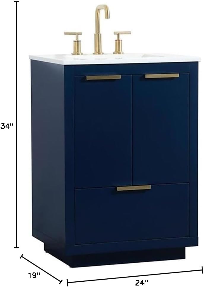 The Blake collection vanity cabinet will be a modern furniture statement piece in your bathroom. Our color combination creates a calming atmosphere in the room. The gold handles bring a vibrant touch to balance the vanity. With the simplistic clean lines, the cabinet catches eyes with its beautiful smooth surface. Open the cabinet doors to store what you desire and make use of the spacious area. Gently close the door and the soft closing glides will quietly closes the door. To top it off, the calcatta quartz adds a luxury and modern finish to the durable stonetop.Features:- Materials: Aluminum alloy, MDF- Finish: Blue- Comes with an undermount porcelain sink and a durable calcatta quartz stone top- Drawer and doors are designed with soft closing glides- Features one drawer to store your bathroom essentials- Countertops are predrilled with 3 holes to accommodate a variety of faucets ( faucets are not included)- Accented with gold minimalistic handle- Rectangle shapeSpecifications:- Product Dimensions: 34"H x 24"W x 19"D- Product Weight: 112.2 lbs- Warranty: 1 year limited- Product Dimensions: (Countertop) 24"L x 19"W x 0.71"H- Product Weight: (Countertop) 32 lbs- Product Dimensions: (Sink) 8.25"H x 15.36"W x 10.24"D- Product Dimensions: (Sink Drain hole) 1.77"- Product Dimensions: (Faucet hole) 1.38"- Number of Drawers: 1- Drawer Dimensions: 8.98"H x 19.88"W x 14.37"D- Product Dimensions: (Drawer Handle) 0.7"H x 0.6"W x 5.9"D- Number of Doors: 2- Product Dimensions: (Door Handle) 0.7"H x 0.6"W x 5.9"L- Product Dimensions: (Drawer Handle) 3.78"- Cabinet Dimensions: (Interior) 19.92"H x 22.01"W x 17.8"D- Leg Dimensions: 2.36"H x 24.57"W x 15.36"D