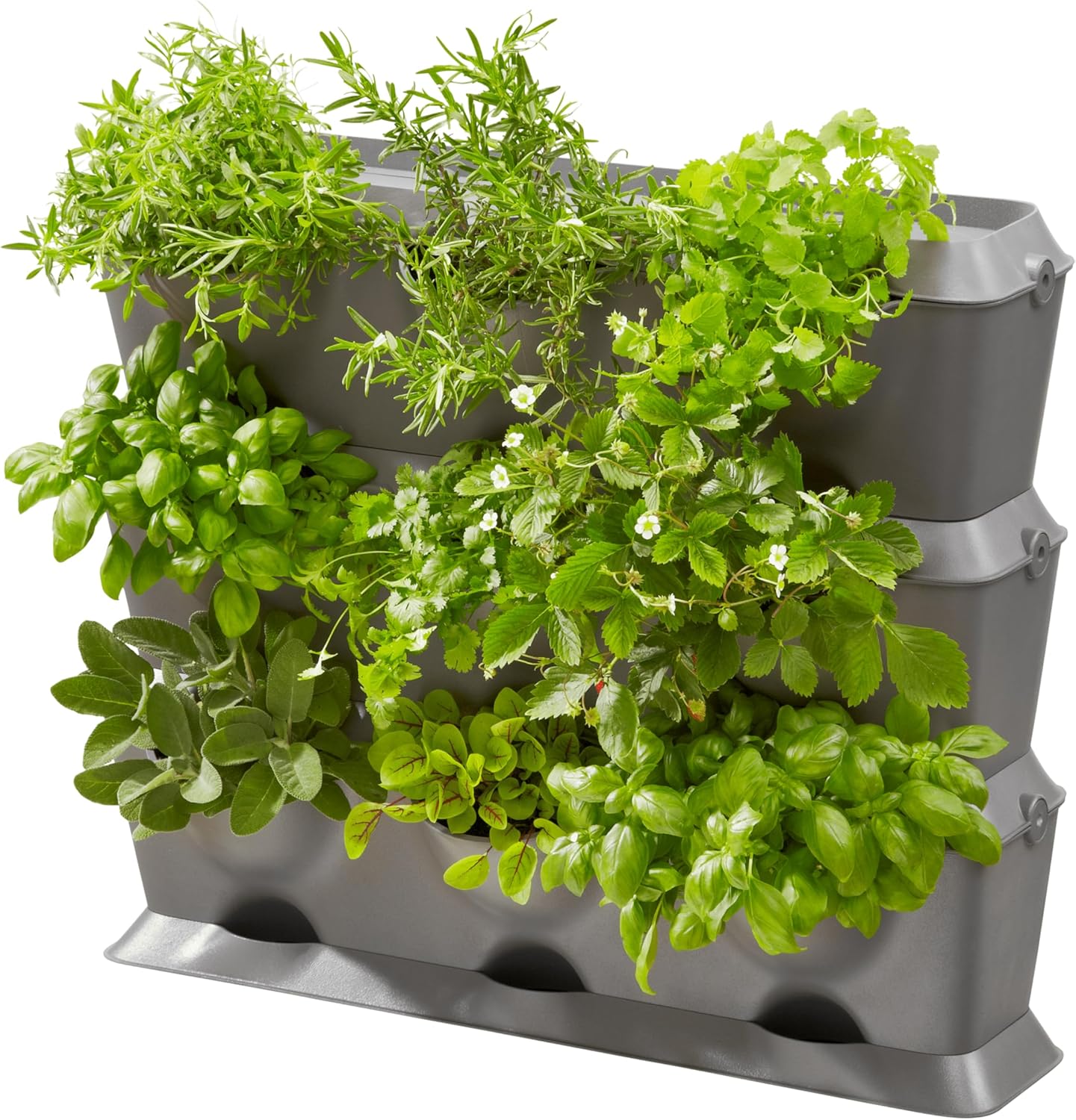 GARDENA Nature up! the basic vertical set is the flexible system for quickly and effortlessly transforming stark walls into eye-catchers, with flowers, herbs and vegetables. The flexible push-in system with weatherproof plastic containers has a modular design allowing it to be extended and connected without tools. The planters can be positioned on the floor or safely secured on walls. A drainage system in every single planter ensures that there is no waterlogging. Excess water in the gaps of the containers is drained off in a controlled manner and collects in the drip pan in the baseplate. This ensures that the wall and floor are kept clean and prevents cross-contamination with germs and bacteria from one level of the planter to the next. For optimum water Supply, Nature up! can be used with compatible irrigation sets optionally combined with a water computer. The set includes 3 vertical planters, 3 covers, 1 baseplate and 12 connection Clips.