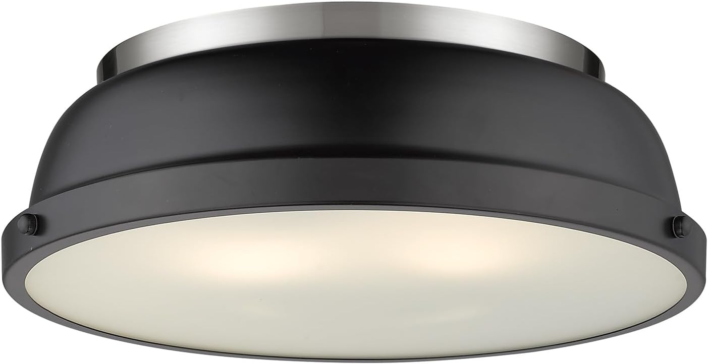 Transform the look of your room with this classic, vintage-inspired fixture, the Duncan collection is contemporary style with an industrial feel. The collection features a variety of simple, traditional silhouettes that are a nod to a bygone era. A variety of plated and painted metal shade finishes are offered in combination with durable Aged Brass, Black, Chrome or Pewter fixture bodies. This flush mount is perfect for modern or contemporary style home decors. It works perfectly in a kitchen, hallway or bath and is UL approved for damp locations.
