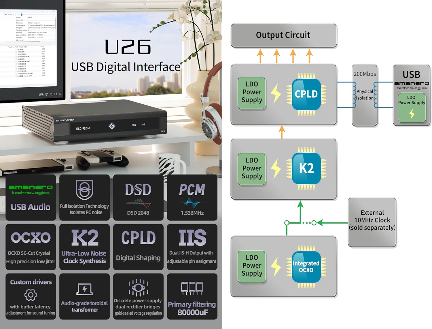 GUSTARD U26 USB Digital interface ▶️ AmaneroTechnologics USB Audio ▶️ Full Isolation Technology Isolates PC noise ▶️ DSD 2048 ▶️ PCM 1.536MHz ▶️ OCXO SC-Cut Crystal High precision low jitter ▶️ Ultra-Low Noise Clock Synthesis ▶️ CPLD Digital Shaping ▶️ Dual IIS-H Output with ▶️ Adjustable pin assignment ▶️ Custom drivers with buffer latency adjustment for sound tuning ▶️ Audio-grade toroidal transformer ▶️ Discrete power supply dual rectifier bridges gold-sealed voltage regulation ▶️ Primary filtering 80000uF Specs Digital Inputs: USB Type-B (USB 2.0 compatible) 10MHz BNC clock input (50Ω, 0–20dBm) Digital Outputs: Coaxial: 75Ω, 500mV P-P @ 75Ω load, PCM 24-bit/44.1–384kHz, DoP64–128 AES (XLR): 110Ω, 2.1V P-P @ 110Ω load, PCM 24-bit/44.1–384kHz, DoP64–128 Optical (TOSLINK): PCM 24-bit/44.1–192kHz, DoP64 IIS (LVDS): PCM 32-bit/44.1–1536kHz, DSD 2.82–90.3MHz (DSD64–DSD2048) Clock System: Dual OCXO + K2 PLL clocks, ±0.1ppm accuracy Isolation: 200Mbps full isolation chip Power Supply: Dual linear supplies with toroidal transformer Power Consumption: <15W Dimensions: 13in × 10.2in × 2.6in (330mm × 260mm × 65mm) Weight: 10.6lbs (4.8kg) Packaging Weight: 13.9lbs (6.3kg) AC Input: 115V / 230V, 50/60Hz Package list Gustard U26 USB Digital Interface Power cord USB cable User manual