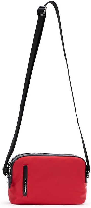 Compact shiny nylon crossover with double zipper for access to the two main compartments, back zip pocket, organized interior. Faux leather detailing, hardware and chrome lettering logo.