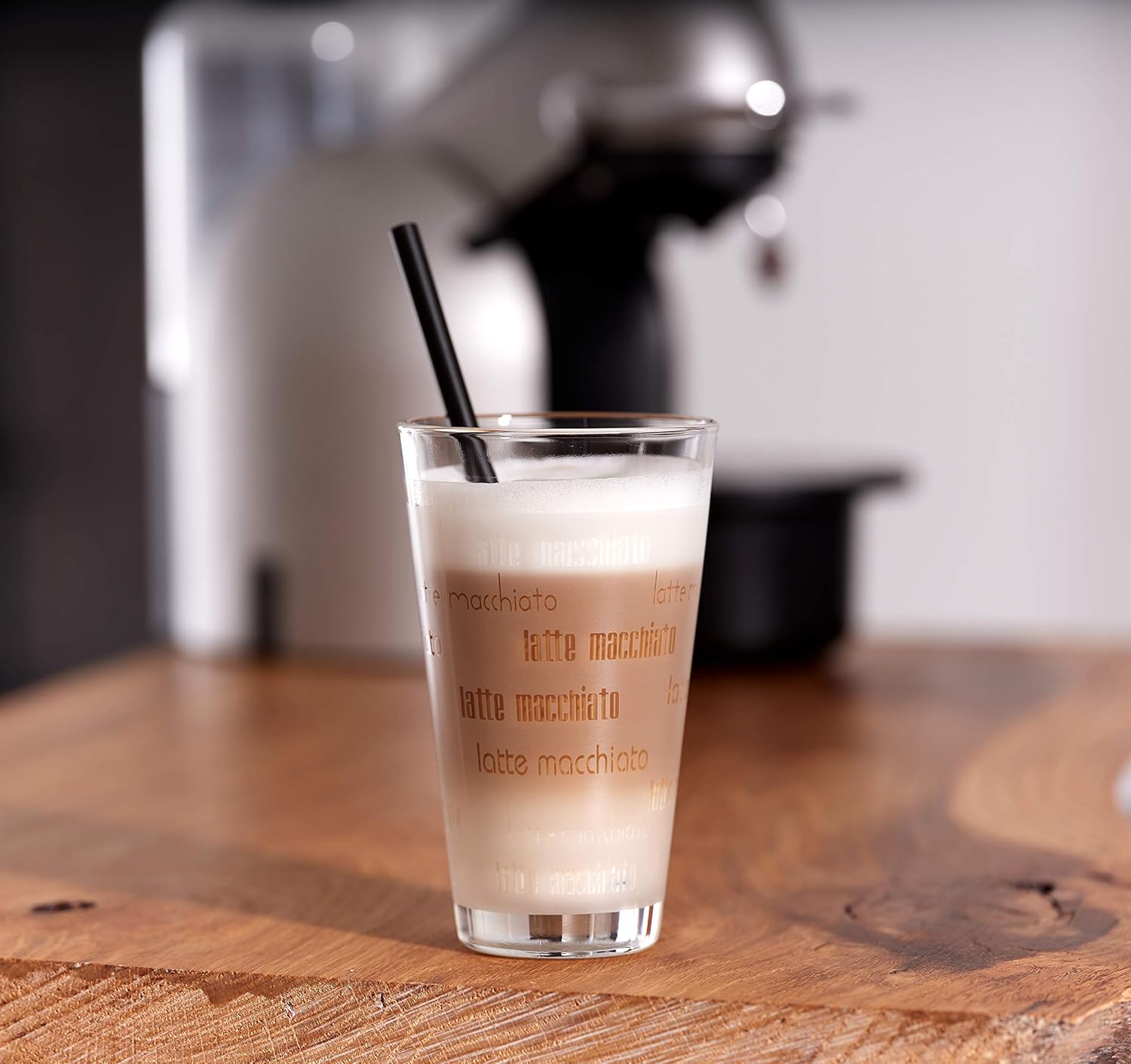 What's more, the trendy writing design of the latte macchiato glasses "Chicco" clearly shows which drink belongs in the glass. The mugs are made from high-quality, dishwasher-safe glass.