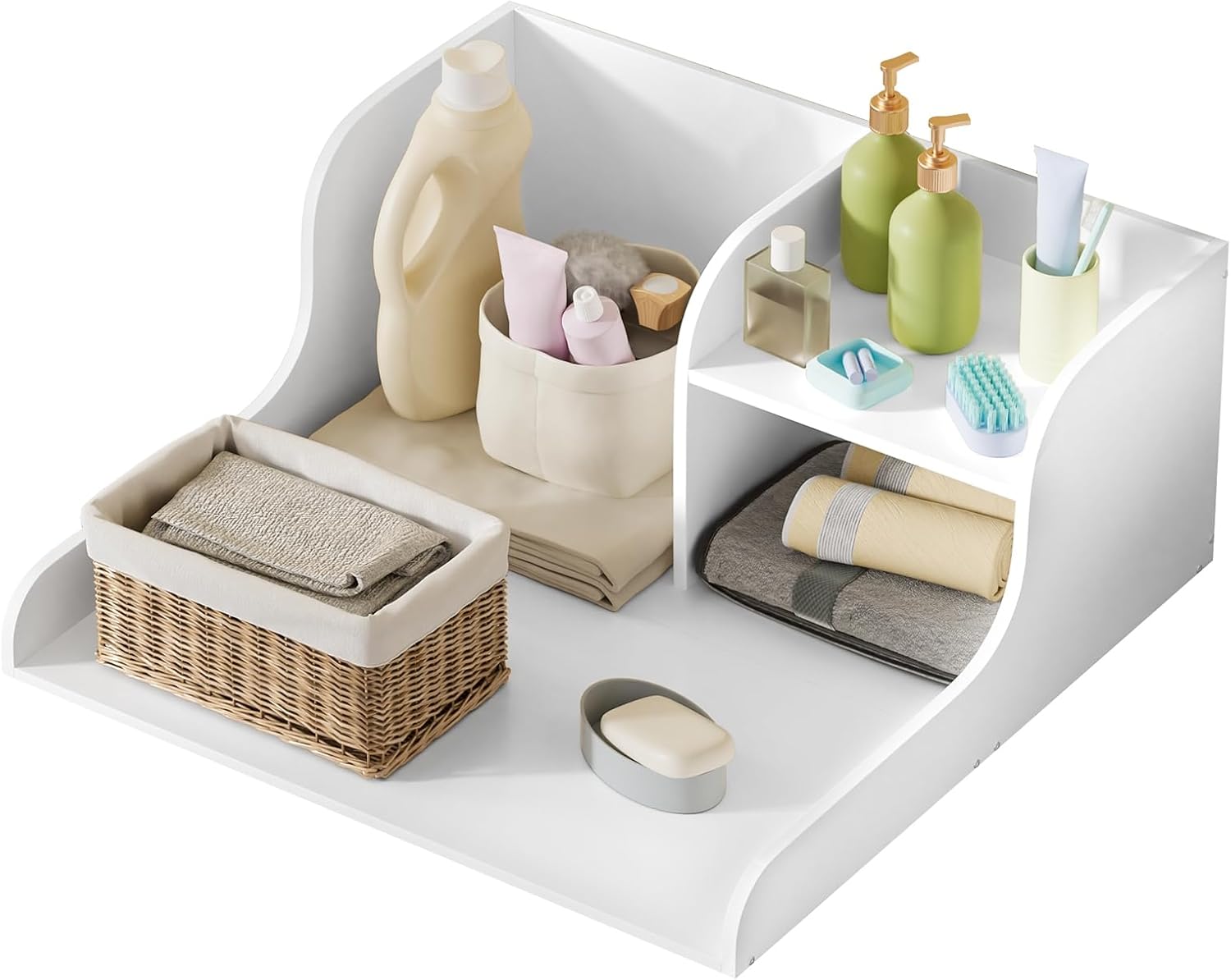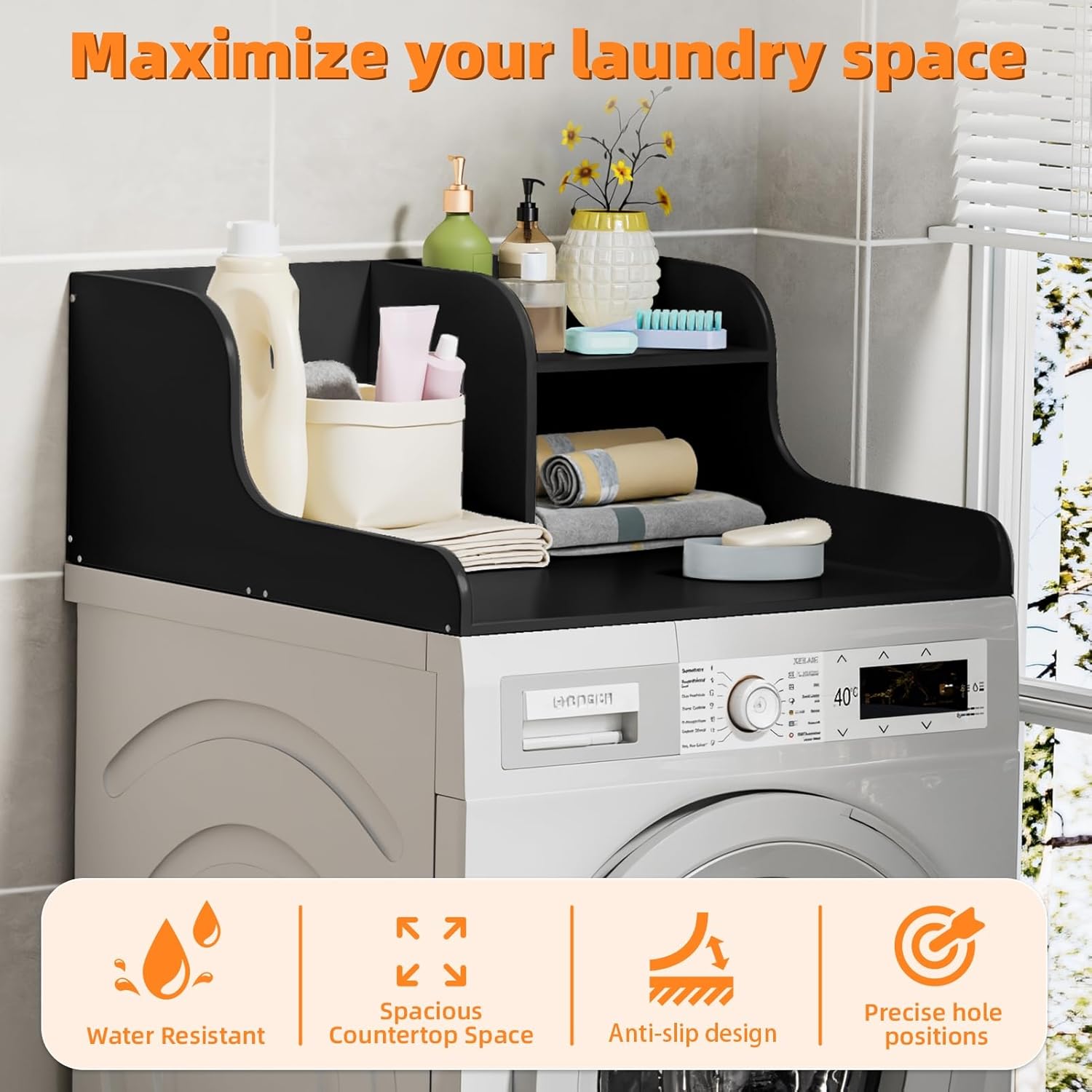 Description:Universal Compatibility: Compatible with most standard washer and dryer models, this countertop showcases a modern and sleek design that perfectly matches various home interior styles, enhancing both the functionality and visual appeal of your laundry space.Stable Anti-slip Safety Design: featuring a bottom anti-slip silicone strip, edge guardrails, and a back baffle, it effectively prevents the machine from vibrating or moving while also stopping items from falling, ensuring a secure and safe laundry environment.Extra Large Countertop Space: the 27.5-inch ultra-wide countertop provides abundant room for folding, sorting, and placing laundry, easily handling the heavy laundry requirements of large families without any hassle.Easy to Install: with a modular design, all accessories and installation tools are included. By following the clear and easy-to-understand instruction manual, a single person can complete the assembly within 15 to 20 minutes, saving you time and effort.Static Load-bearing Capacity up to 110lbs: can stably store heavy items such as laundry detergent, irons, or other household essentials, offering reliable support for your daily laundry operations.Item Name: Washer CountertopMaterial: PlateMaximum Load-bearing: 50KGFeatures: Anti-Slip Strips, Edge Rails, Good Load-bearingSize Details:L: 70cm/27.56", W: 68.5cm/26.97", H: 30cm/11.81" (Approx.)Thickness: 1.5cm/0.59" (Approx.)Notes:Due to the light and screen setting difference, the item's color may be slightly different from the pictures.Please allow slight dimension difference due to different manual measurement.Package Includes:1 x Washer Countertop