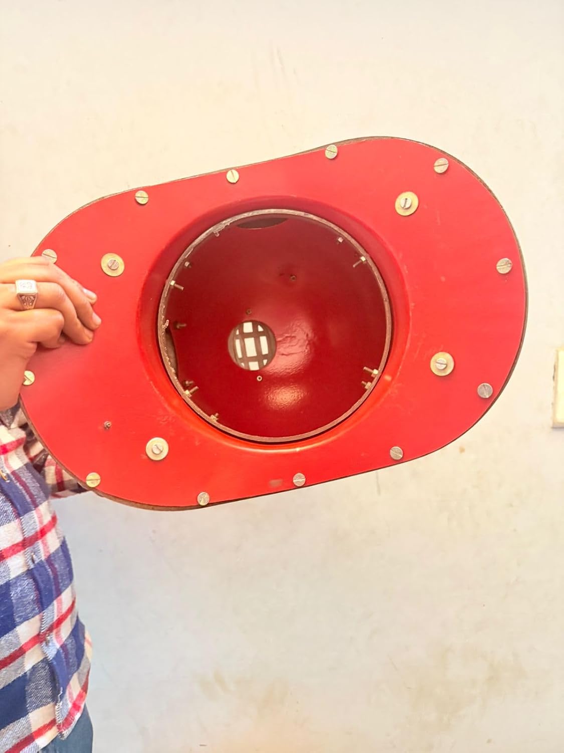 Step into maritime history with this stunning vintage-style diving helmet replica. Featuring a bold red finish complemented by polished brass-tone accents, this decorative piece captures the romance and adventure of classic deep-sea exploration. The helmet showcases authentic details including a circular front viewport, side portholes, air valves, and intricate metalwork that mirrors historical designs. Crafted from metal with meticulous attention to detail, this full-size replica makes an impressive statement piece for nautical-themed spaces, man caves, or maritime collections. The helmet includes distinctive features like adjustable knobs, riveted construction, and a manufacturer's plate, adding to its authentic appearance. Perfect as a conversation-starting decorative element for homes, offices, restaurants, or themed venues, this replica brings a touch of underwater heritage to any setting. The substantial construction and professional finish ensure this piece will remain an eye-catching display item for years to come.