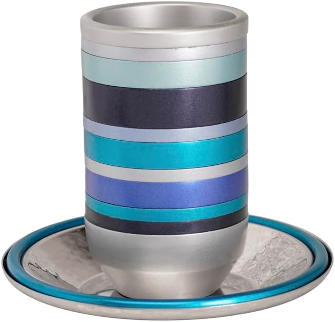 Add a touch of elegance to your Shabbat and holiday table with this exquisite anodized aluminum Kiddush cup by Yair Emanuel. Designed with a sleek modern silhouette, this cup features stunning multicolored rings, blending contemporary artistry with Jewish tradition. The set includes a beautifully crafted matching saucer with a polished hammered finish and a vibrant anodized rim, providing a perfect surface for placing the cup while reciting the Kiddush blessing. Made from high-quality anodized aluminum, this Kiddush cup is lightweight, durable, and resistant to tarnishing, ensuring years of use. Perfect for Shabbat, holidays, and Jewish celebrations, this unique Kiddush cup makes a meaningful and stylish gift for weddings, Bar & Bat Mitzvahs, housewarmings, and other special occasions. Choose from multiple color variations to match your personal style or Judaica collection.